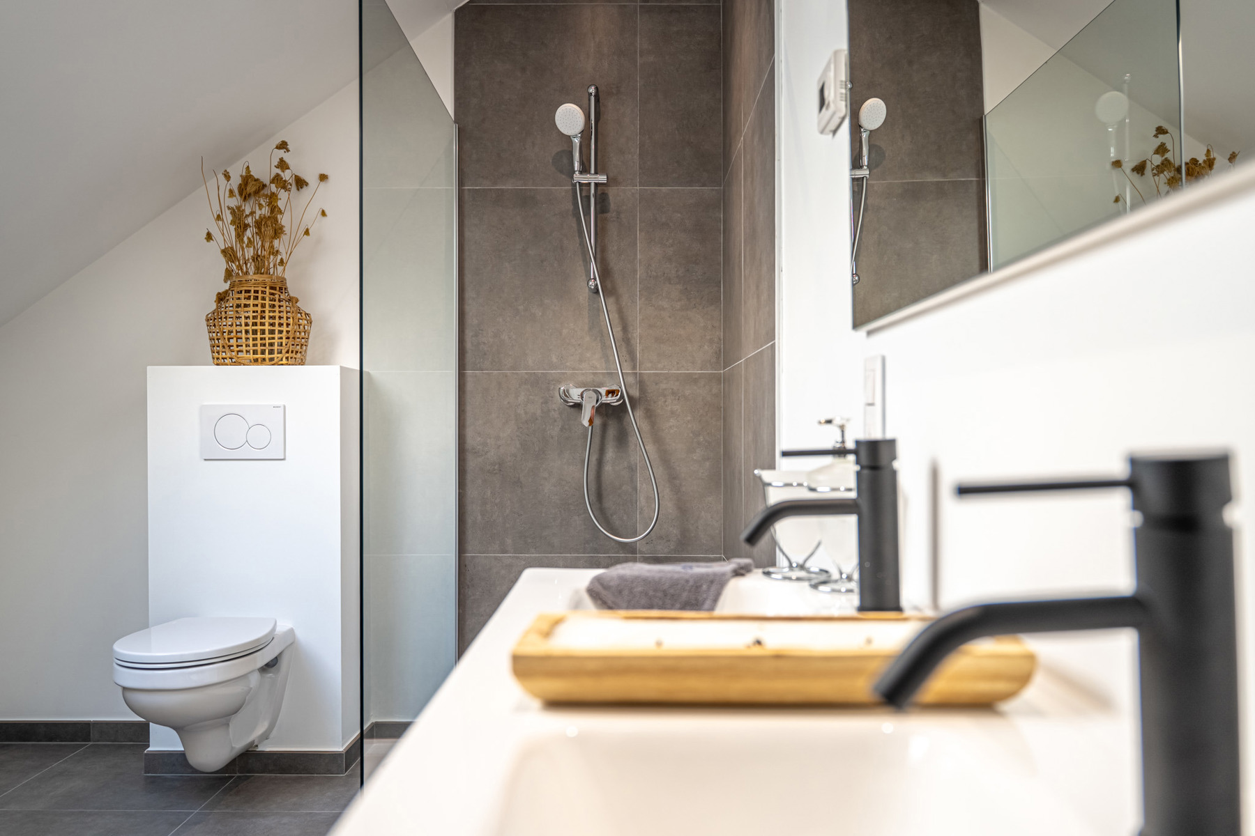 Caractéristiques : VMC simple flux de type C avec extraction dans les chambres et locaux humides - Chauffage central gaz (cuve collective) avec chauffage sol - Chaudière - Citerne d'eau de 5.000L - châssis double vitrage PVC avec seuil en pierre bleue - Portes intérieures prêtes à peindre - escalier en hêtre de 1er choix - Carrelages au choix 60*60 avec plinthes assorties (rez-de-chaussée -hall de nuit- SDB) - 2 places de parking privatives.